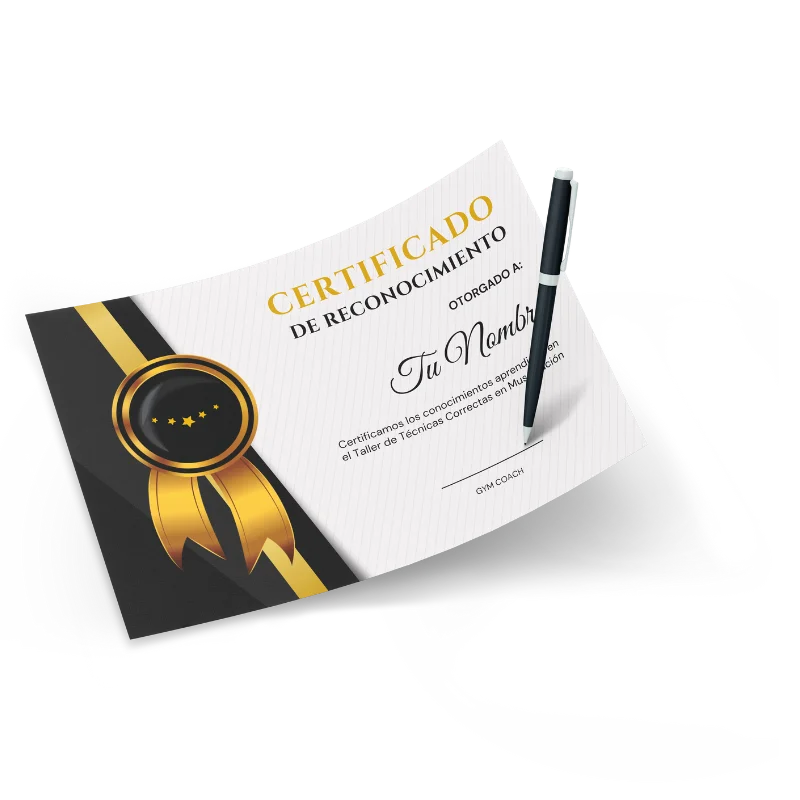 Al finalizar el Taller de Técnicas Correctas en Musculación, vamos a reconocer tu esfuerzo y práctica con un Certificado de Finalización con tu nombre.